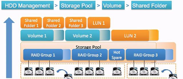 物理硬盘 HDD/SSD 构成存储池 Storage Pool,存储池之上划分卷 Volume,卷上划分共享文件夹 Shared Folder。