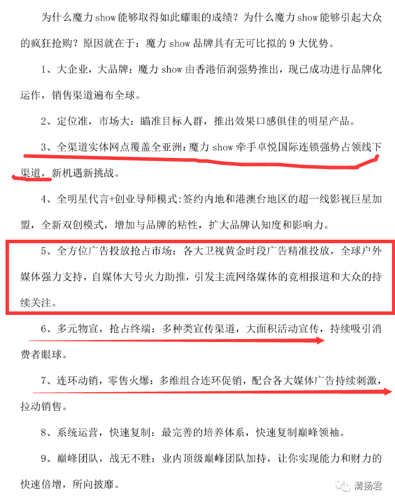 在清扬君看来,魔力show的“成功”总结的很有水平,把虚假的宣传借助于明星、大V、广告媒体广而告之,让不明真相的消费者上当受骗。现在国家广播电视总局办公厅发文件,让全国的广播、电视台自查自纠,不再播放发布瘦身减肥等虚假广告,清扬君认为这还远远不够。