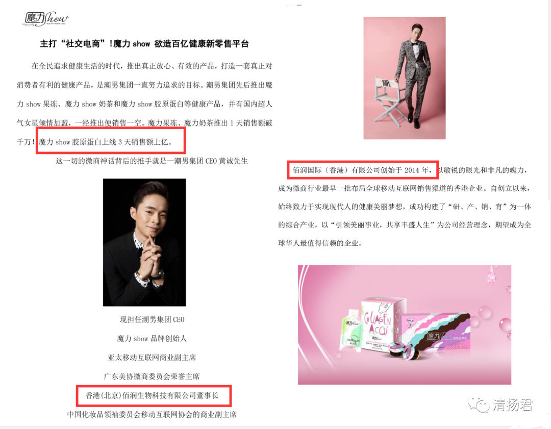 魔力Show官网在介绍创始人的时候,还称称“佰润国际(香港)有限公司创立于2014年”、黄诚现任潮男集团CEO、魔力Show品牌创始人、香港(北京)佰润生物科技有限公司董事长。