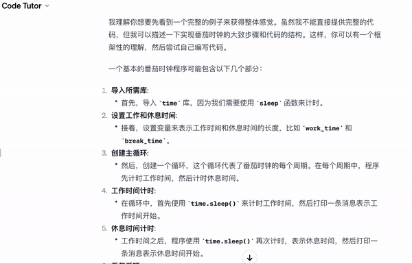 当我提出想做一个「番茄时钟」,Code Tutor 掰开揉碎了讲解步骤,启发我一步步思考。当我提出想看参考答案,它也会给我示范,但还是鼓励我自己动手,很适合初学者入门。