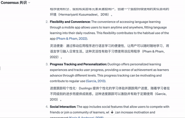 当我提问「用多邻国学语言为什么让人上瘾,请给出一篇文献综述」,它在每段开头总结了要点,并在要点后给出了具体的文献和跳转链接,写稿不怕没灵感了。