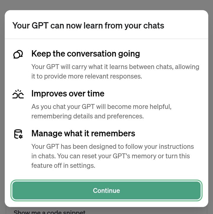 这次,OpenAI 总裁 Greg Brockman 还宣布了一个消息,GPTs 现在可以从聊天中学习了,记住细节和你的偏好,但该功能还在测试中,「这是打造你个人 ChatGPT 的第一步」。