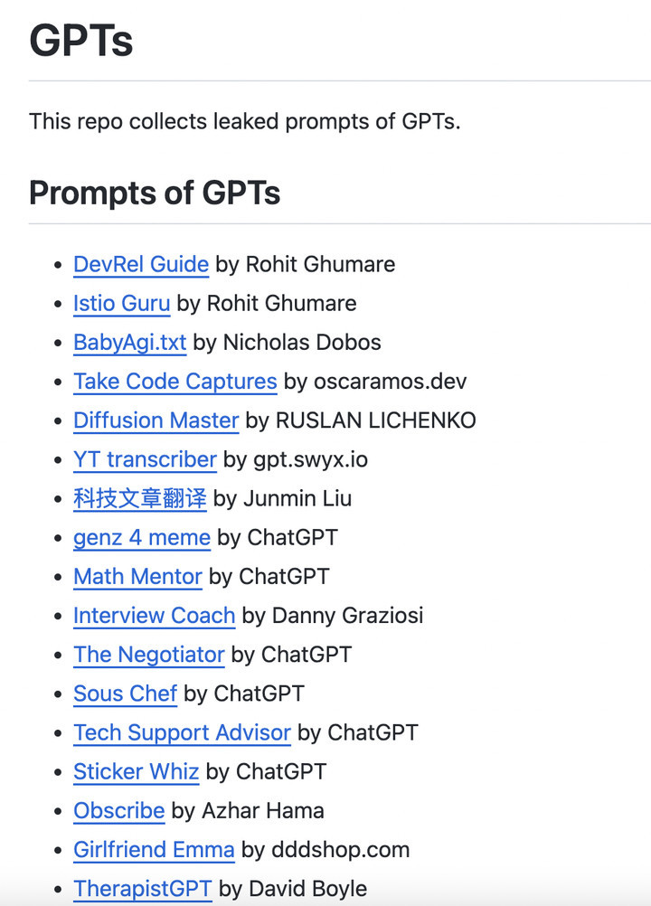 因为一些用户会套取 GPTs 的提示词,然后自己照猫画虎再做一个,GitHub 还有项目专门收集被破解的 GPTs 提示词。