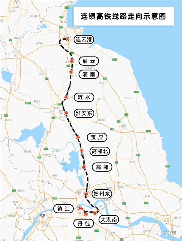 连镇高铁北起连云港,一路向南经淮安、扬州,跨江到达苏南镇江。此次通车的是淮安至镇江段,连上去年已经通车的淮安至连云港段,苏南、苏中、苏北第一条南北纵横走向铁路终于贯通。