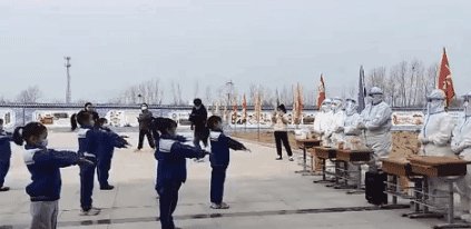 365度环绕拍摄,统一穿着校服的孩子们,和统一穿着防护服的工作人员们,都成了这场“秀”里的工具人。