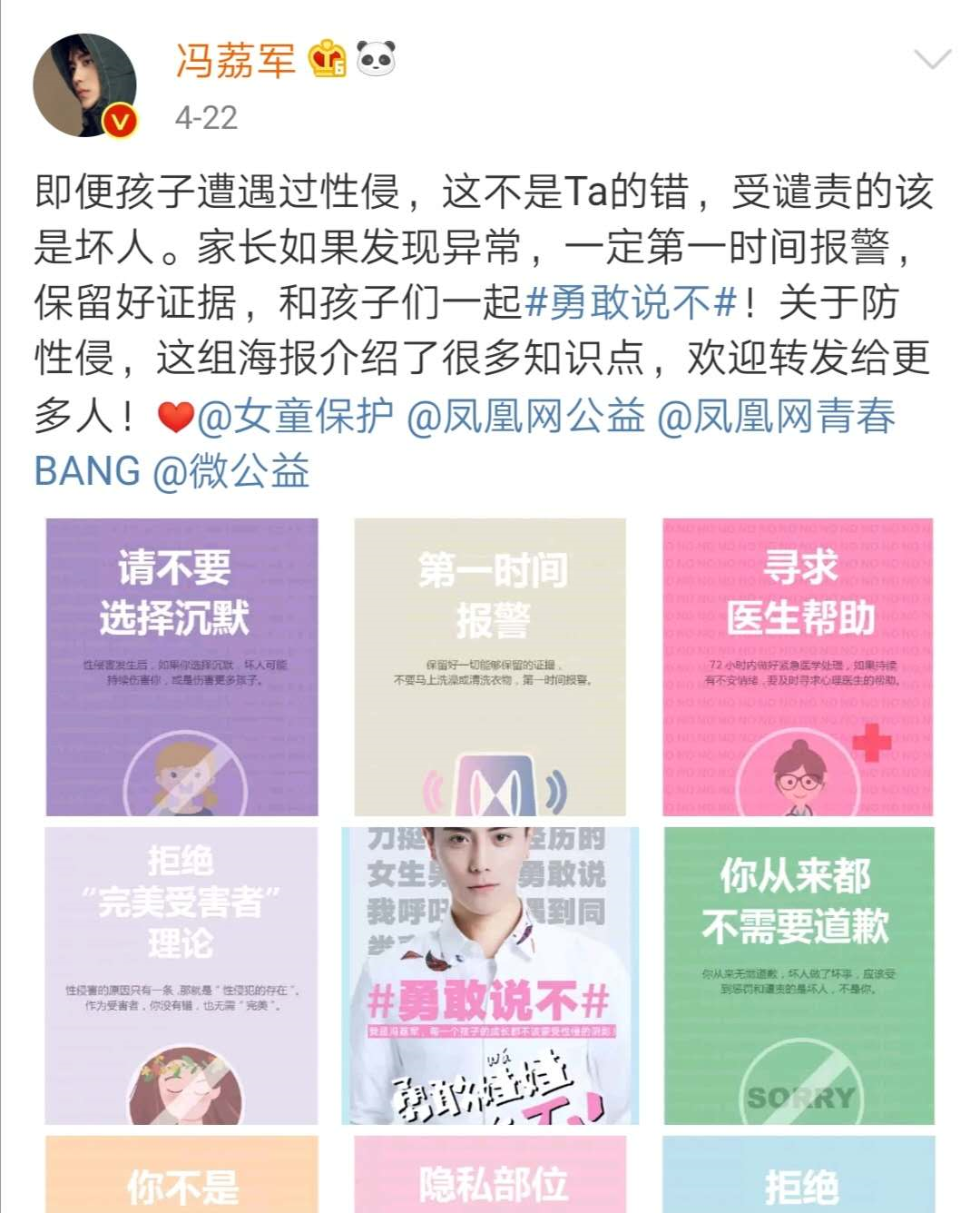 4月22日,冯荔军参与勇敢娃娃“勇敢说不”防性侵知识普及与教育线上活动,鼓励孩子们在遭遇性侵害的时候,勇敢拒绝,勇敢说“不”,倡导社会大众对受害者更包容,营造平等环境。