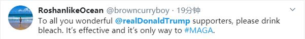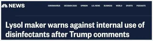 此外,NBC 也指出,特朗普政府的食品和药物管理局就曾特别警告人们,不要饮用消毒剂(这涉及一条在美国盛行数十年的谣言,有人把消毒剂当作治疗自闭症和艾滋病的方法),食品和药物管理局明确指出,食用此类“产品可能会引起恶心,呕吐,腹泻及严重脱水等症状。”