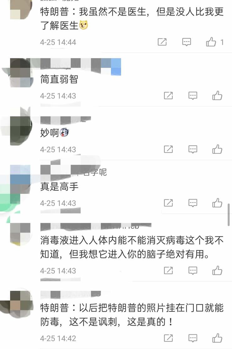 有趣的是,对于舆论的批评,特朗普 24 日表示,他前一天的讲话只是表达讽刺,并不是要推荐美国人注射消毒液,“我觉得手上用消毒液可能会有很好的效果。”“我不是医生,人们应该咨询医生。”
