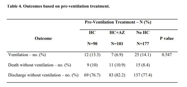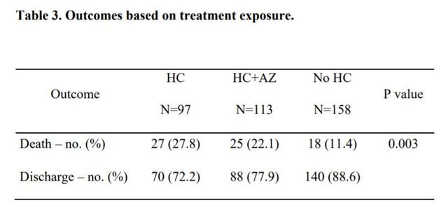 羟氯喹治疗组的机械通气率,为 13.3%;羟氯喹联合阿奇霉素组,为 6.9%;未服用羟氯喹组为 14.1%。关于未使用通气的病死率,在羟氯喹治疗组为 10%;羟氯喹联合阿奇霉素组为 10.9% ;未服用羟氯喹组为 8.4% 。