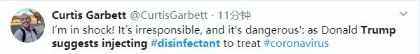 前世卫组织官员高斯廷(Lawrence Gostin)说,特朗普之前推荐抗疟疾的药物来治疗新冠肺炎,国家卫生研究所已经表示那是有害的,现在特朗普又提出紫外线照射、注射消毒剂等如此危险的建议。从科学常识来看,那是很危险的,如果大肆宣扬一些有风险的言论,民众有可能会为此付出生命代价。