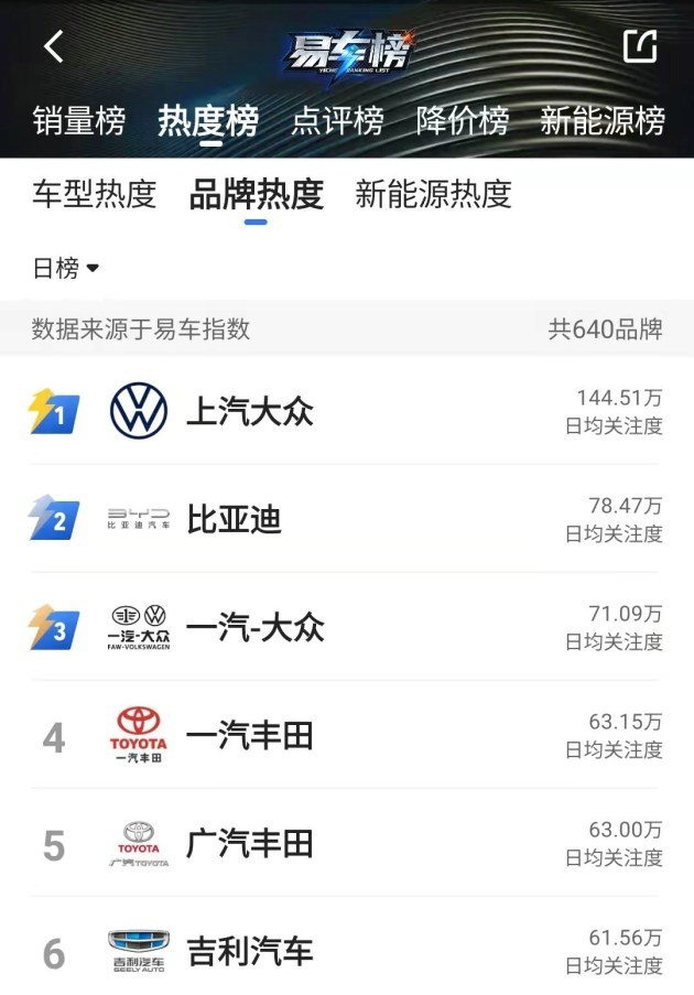 根据易车App“热度榜”显示的数据,一汽丰田和广汽丰田分别排名第4位和第5位。如需更多数据,请到易车App查看。