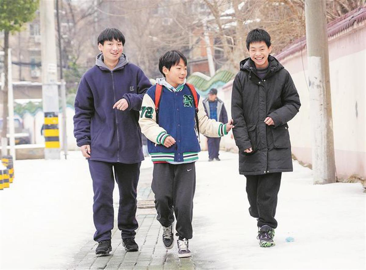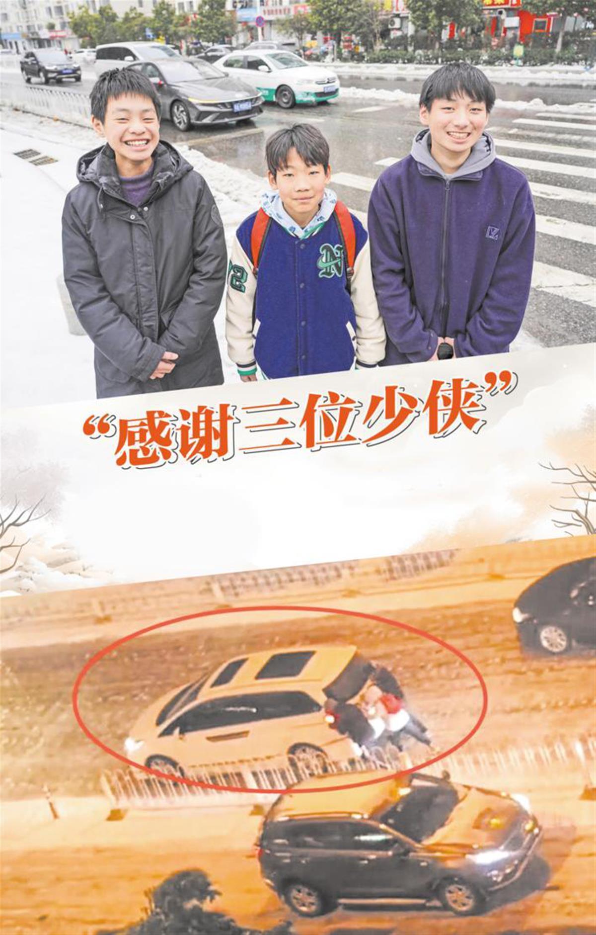 On the afternoon of the 22nd, the threeboyshad made plans to playin the snow. When they arrived at the T-junction between Qianshuiwan Road and Zhuodaoqun South Roadat about 3 p.m, they saw a young student fall off a bike and quickly rushed to help him. At this moment, a taxi got stuck on the icy road which was now slippery, and passers-by called the three boys to help pushthe car. With concerted efforts, the taxi was freed, and the driver thanked everyone, which fueled the boys’ enthusiasmto help others.