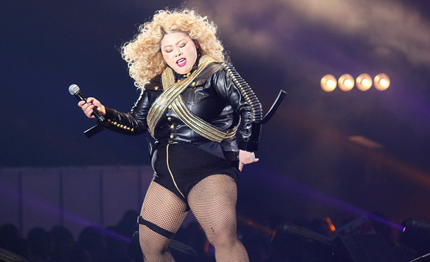 从天而降的她一度冲上国内微博热搜,大家纷纷议论这个重量级选手是谁,一度还和韩红老师搞了个混, 创造出“韩红从天而降模仿Lady Gaga超级碗表演”的微博热词 。
