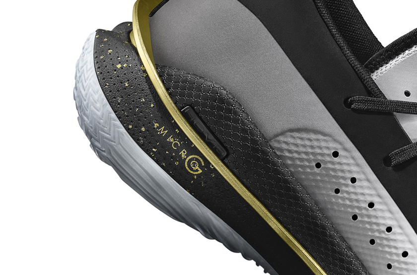 细节部分,后跟 SC 标志、中底 Flexible Plate 科技弹性支撑片和中底泼墨以金色点缀,提升奢华气质。