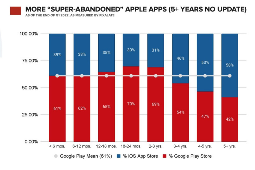 Pixelate 研究公司获取了两家应用商店在2022年3月31日的快照,将一款应用程序描述为如果两年以上没有更新,则该应用程序表示已被废弃。如果应用程序在五年或更长时间内没有更新,它会将应用程序称为“超级废弃”。