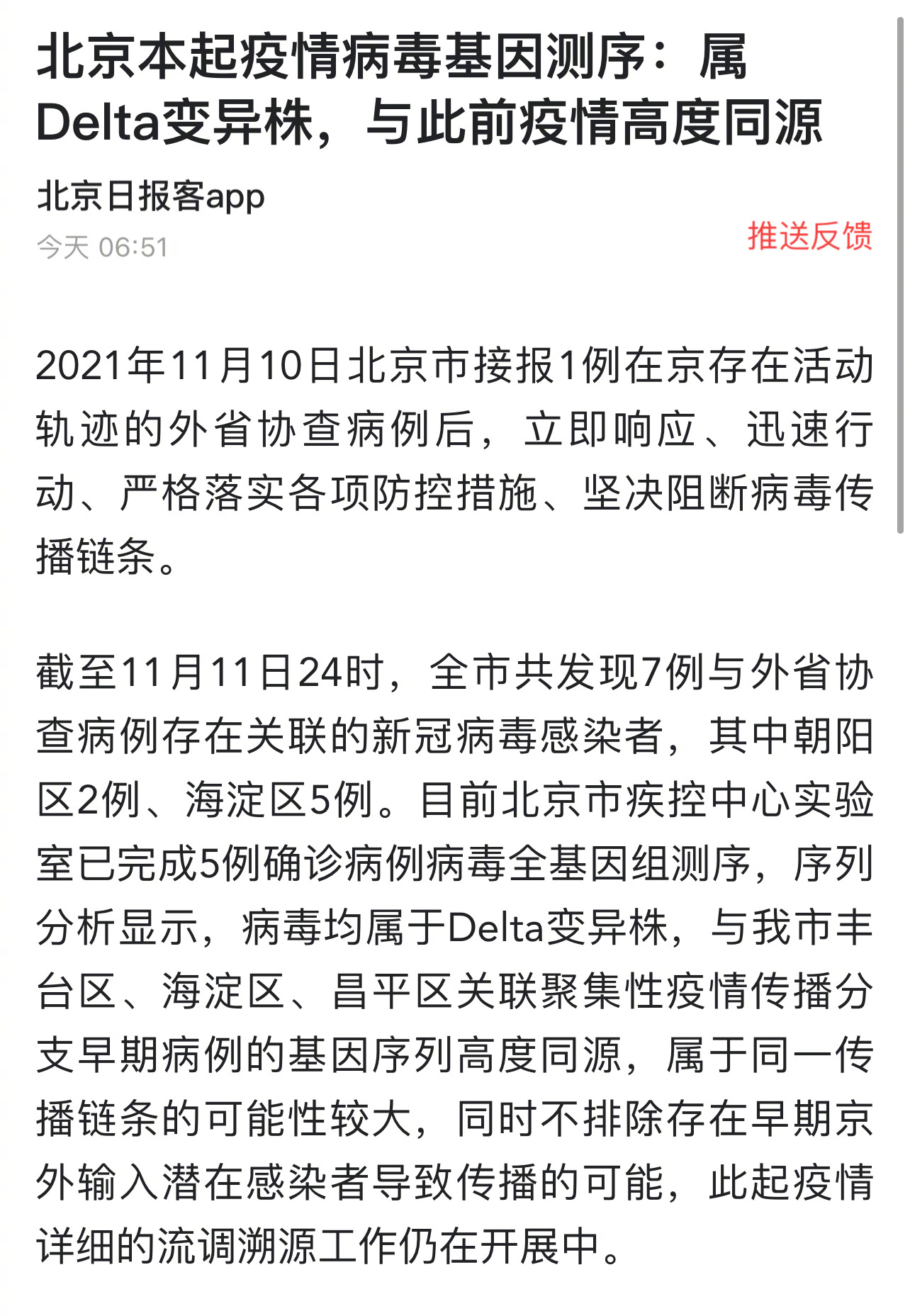 #北京本起疫情病毒为德尔塔变异株#【北京本起疫情病毒基因测序:属Delta变异株,与此前疫情高度同源】#北京本起病毒基因测序与此前疫情高度同源# 截至11月11日24时,全市共发现7例与外省协查病例存在关联的新冠病毒感染者,其中朝阳区2例、海淀区5例。目前北京市疾控中心实验室已完成5例确诊病例病毒全基因组测序,序列分析显示,病毒均属于Delta变异株,与我市丰台区、海淀区、昌平区关联聚集性疫情传播分支早期病例的基因序列高度同源,属于同一传播链条的可能性较大,同时不排除存在早期京外输入潜在感染者导致传播的可能,此起疫情详细的流调溯源工作仍在开展中。(北京日报,嘉玛)