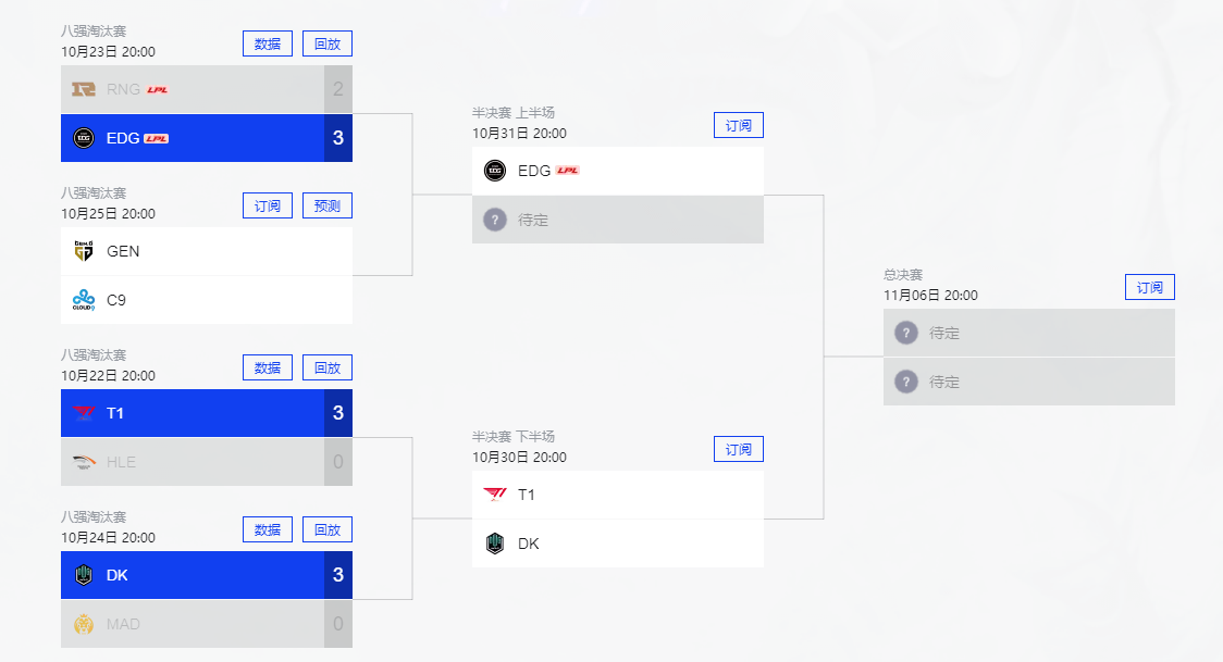 RNG 和 EDG 在昨晚的八进四比赛中内战,EDG 以 3:2 的比分战胜 RNG,成功晋级,EDG 将在接下来的半决赛中对阵到 GEN 和 C9 的胜者。