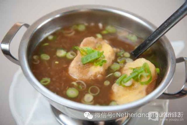 洋葱汤(Union soup Giethoorn style);面包;鱼排/猪排,配蘑菇,包括蔬菜沙拉,面条或薯条;饮料:茶水