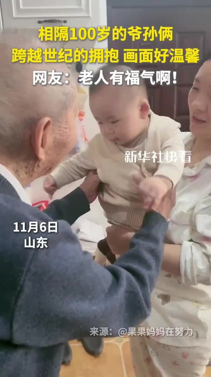 相隔100岁的爷孙俩,跨越世纪的拥抱,画面好温馨,网友:老人有福气啊