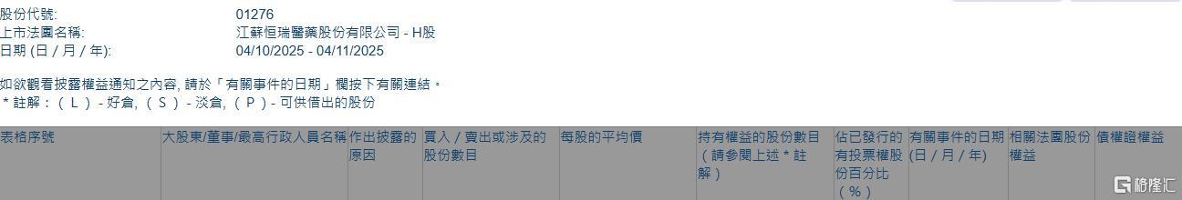 格隆汇11月4日丨根据联交所最新权益披露资料显示,2025年10月30日,恒瑞医药(01276.HK)获Wellington Management Group LLP在场内以每股均价73.65港元增持101.22万股,涉资约7455.08万港元。