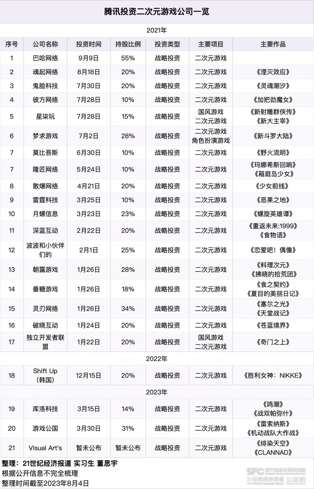 (2021至2023年腾讯投资二次元游戏公司一览。图/21世纪经济报道 实习生 董思宇)