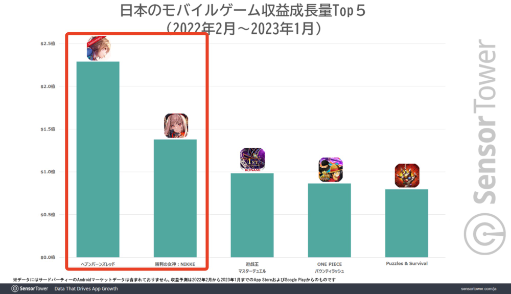 (《绯染天空》在2022年2月至2023年1月期间的营收增长量超过了《胜利女神:NIKKE》数据来源:SensorTower)