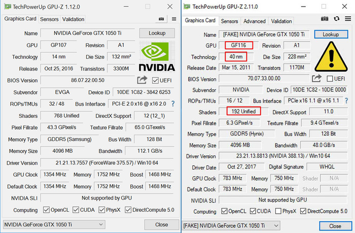 而目前也的确有大量显卡深受其害,一个典型例子就是只有192个流处理器的GTX 1050Ti——真正的1050Ti拥有768个流处理器,这妥妥的是一张假卡,是用GTS450刷入1050Ti的BIOS伪装而来的。不少朋友到淘宝买显卡或者整机,可能就会陷入这类假卡的深坑。