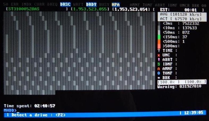既然SMART信息已经不靠谱,就只能另寻他法来鉴别HDD是否有问题。如果想要鉴别HDD是否有坏道,可以使用MHDD这样的工具。不过现在HDD的容量普遍较大,MHDD全盘扫描一次可谓旷日长久,需要耐心等待。