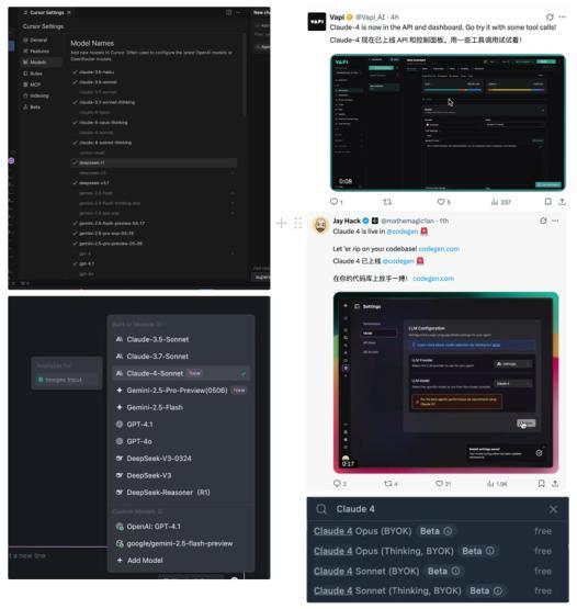 目前,大量的 AI 编程平台(像是 Cursor、Trae、WindsurfVapi、Codegen)、智能体产品(像是 Flowith)内几乎都迅速接入了 Claude 4 系列,毕竟它可能是能进一步提升智能体表现的重要模型。