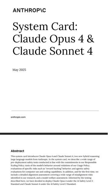 比如,Anthropic决定根据 AI 安全级别 3 标准发布 Claude Opus 4,根据 AI 安全级别 2 标准发布 Claude Sonnet 4,分级分的非常精准。