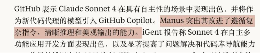 前段时间刚一问世就被网络平台誉为「上帝之手」的 Manus 则在报告中大赞 Claude Sonnet 4,称它复杂指令遵循能力和输出的美观度非常高。