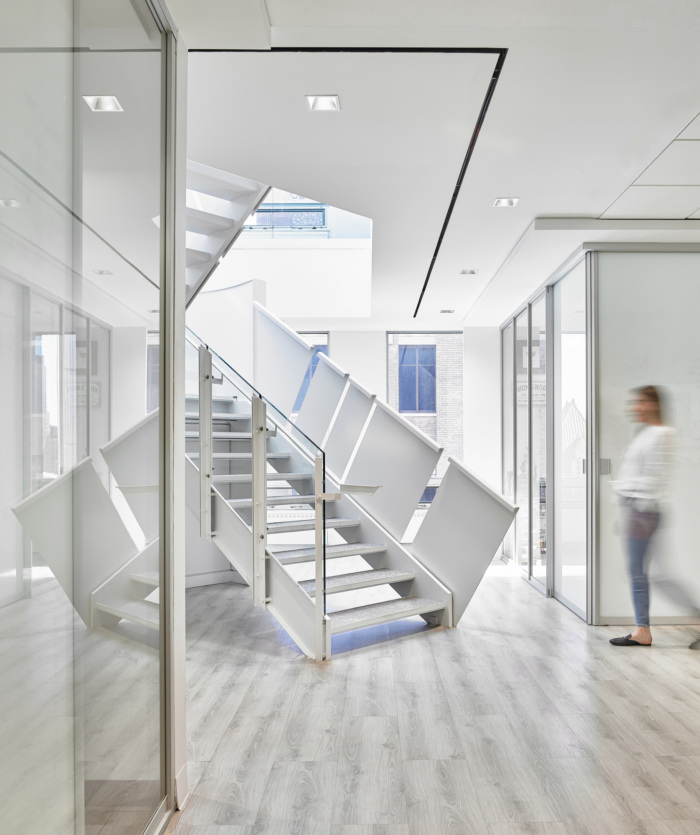 接待室的两侧都装有玻璃的私人会议室,在8层形成了无缝的透明度。天花板处理提供了活动空间的多样性和动画效果,以及沿着接待处延伸的照明光墙。第9层和第10层通过现有的类似雕塑的楼梯相连,这使律师可以无缝地和私密地连接。从电梯走出第一步,您会被充满活力的服务员欢迎,该服务员旨在鼓励交谈。这些楼层主要用于合作伙伴和文员办公室以及行政支持。两层都与整个空间的辐射和透明外观一致。