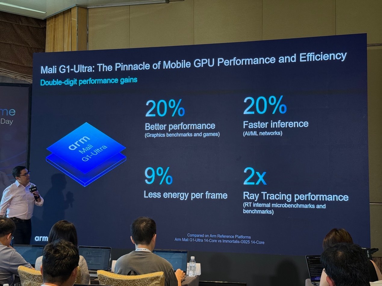 GPU 部分,Mali G1-Ultra 较 Immortalis-G925 在AI 与机器学习网络上的推理速度提升 20%、能效提升 9%,还支持新一代光线追踪技术,性能相比前代提升 2 倍,图形基准测试性能提升 20%,可以流畅运行《暗区突围:无限》、《堡垒之夜》、《原神》等主流游戏。而 Mali G1-Premium 和 Mali G1-Pro 都有不同程度的 AI 算力和游戏图形处理性能的提升。