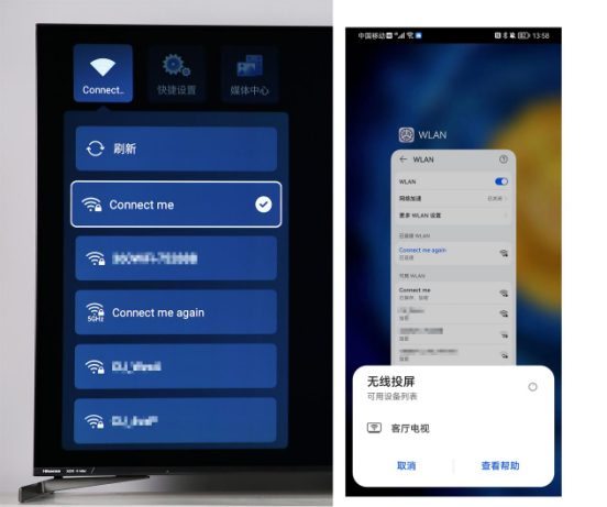 左侧电视连接Connect网络,右侧手机连接Connect me again网络