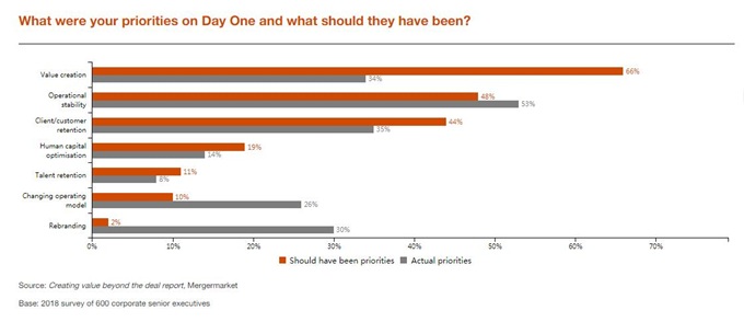 Malcolm Lloyd说:“有趣的是,只有34%的收购者表示,在他们的最新交易中,价值创造是交易结束的优先事项,尽管66%的人表示应该优先考虑。需要不断评估和完善组织内部创造价值的方式。”