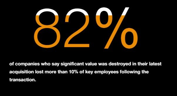 文化为交易的核心:人才管理和人力资本影响企业如何在交易前后传递价值。82%没能在最近一次收购中创造价值的公司表示,在交易后失去了超过10%的员工。
