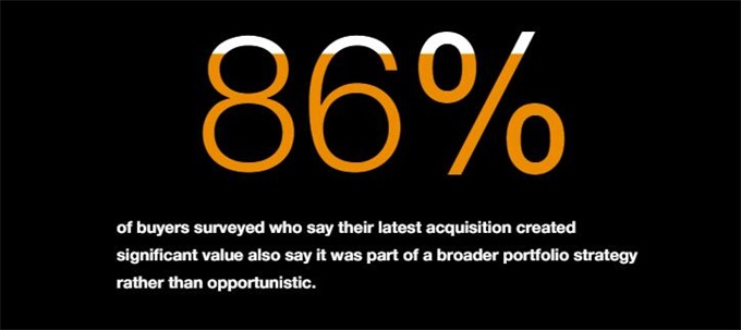 坚持战略意图:公司应把交易当成明确的战略愿景的一部分,让交易活动跟整体业务的长期目标保持一致。表示最近一次收购创造了巨大价值的86%受访者,同时也表达了交易是更广泛的投资组合评估的一部分,而非出于机会主义。