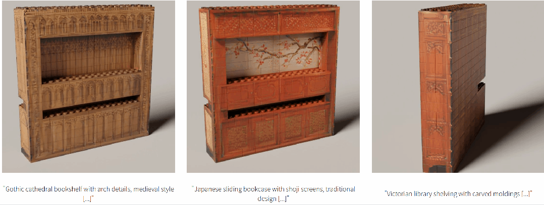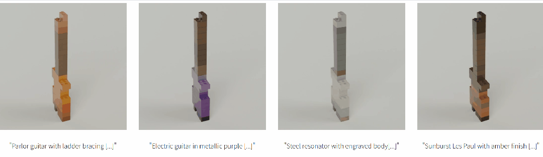 图 5 展示了一系列多样化、高品质的 LEGO 设计,这些设计紧密遵循输入提示。