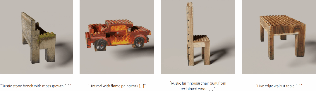 乐高纹理和着色:颜色和纹理在创意乐高设计中也起着至关重要的作用。因此,本文提出了一种应用精细 UV 纹理或为单个积木分配统一颜色的方法。