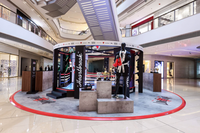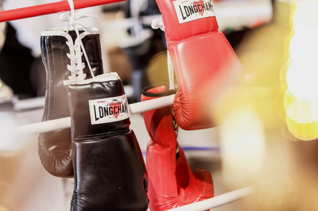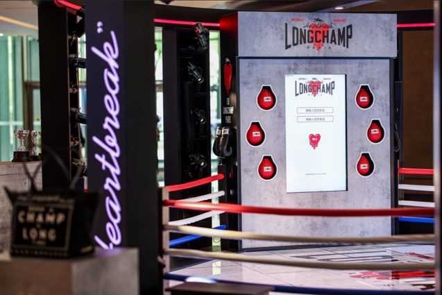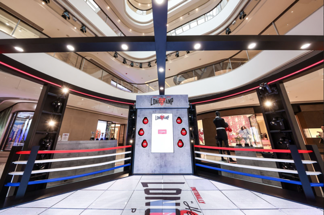 王者擂台现场通过模拟拳击格斗的真实场景,从外观上带来强烈的视觉冲击。巨大的Longchamp x EU联名系列标识占据擂台地面中心,整个拳击擂台布满Longchamp骏马标识与EU爱心元素,法国国旗的红白蓝三色构成了擂台围绳,配合LED灯光效果打造酷炫视觉体验,让人仿佛瞬间置身热血沸腾的拳击赛场之上。