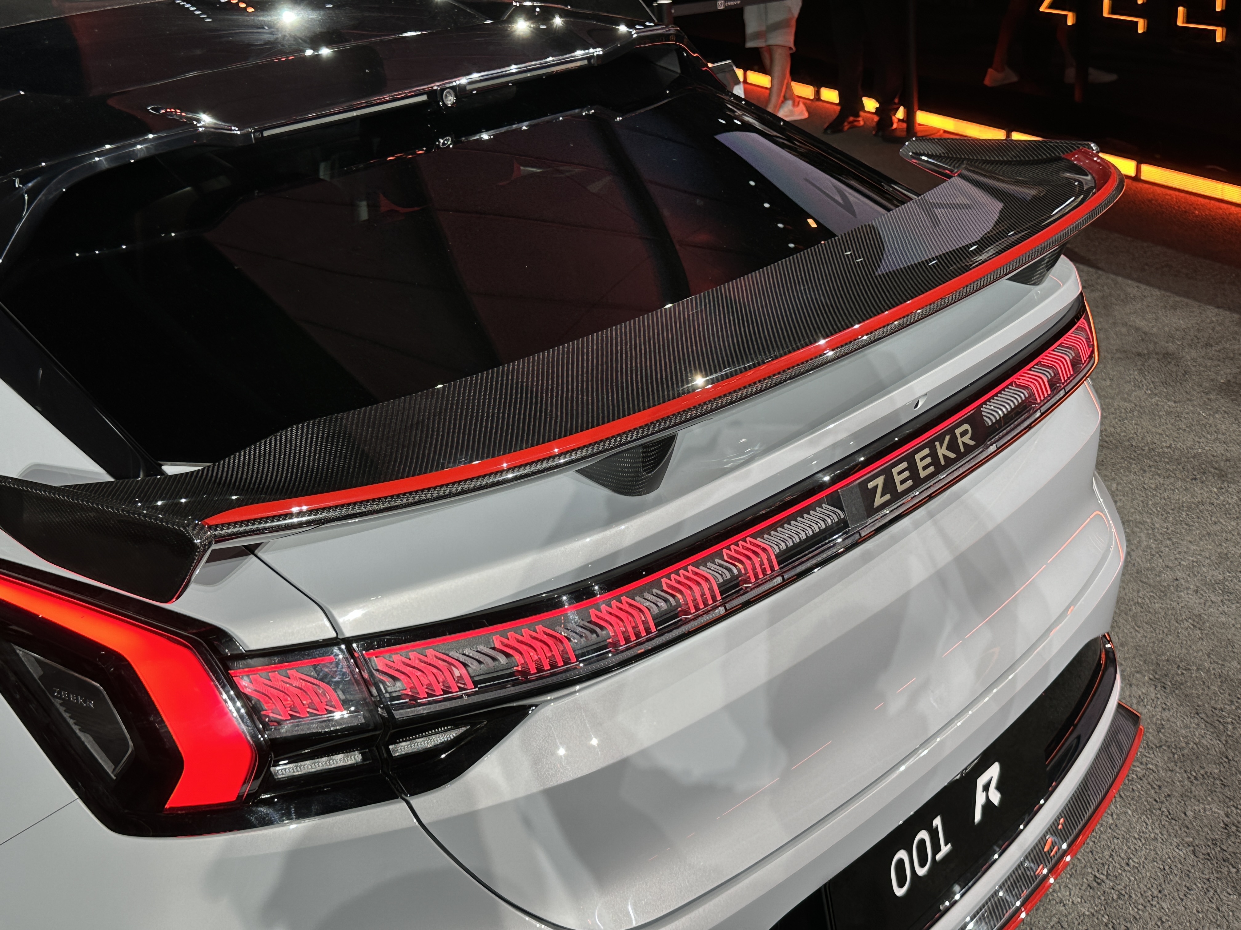 车尾部分,极氪001 FR版在后备箱的上方加入了大尺寸的碳纤维尾翼,并且融入了红色饰条做点缀,搭配后保险杠处夸张的碳纤维后扩散器,不管在空气动力学还是在重量上都有积极地作用,在整体的视觉感受上同样营造出十足的运动感。