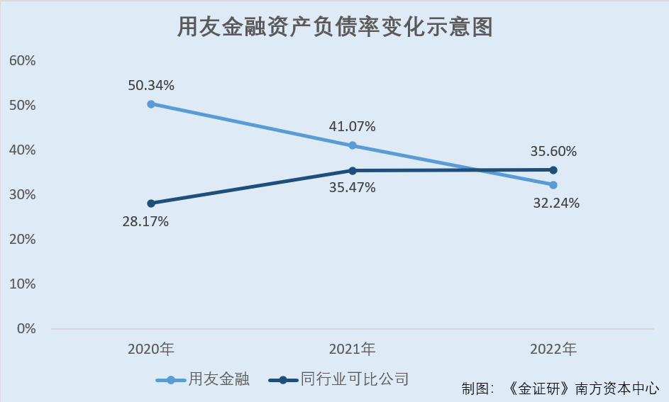 2020-2022年各年末,用友金融同行业可比公司的资产负债率均值分别为28.17%、35.47%、35.6%。