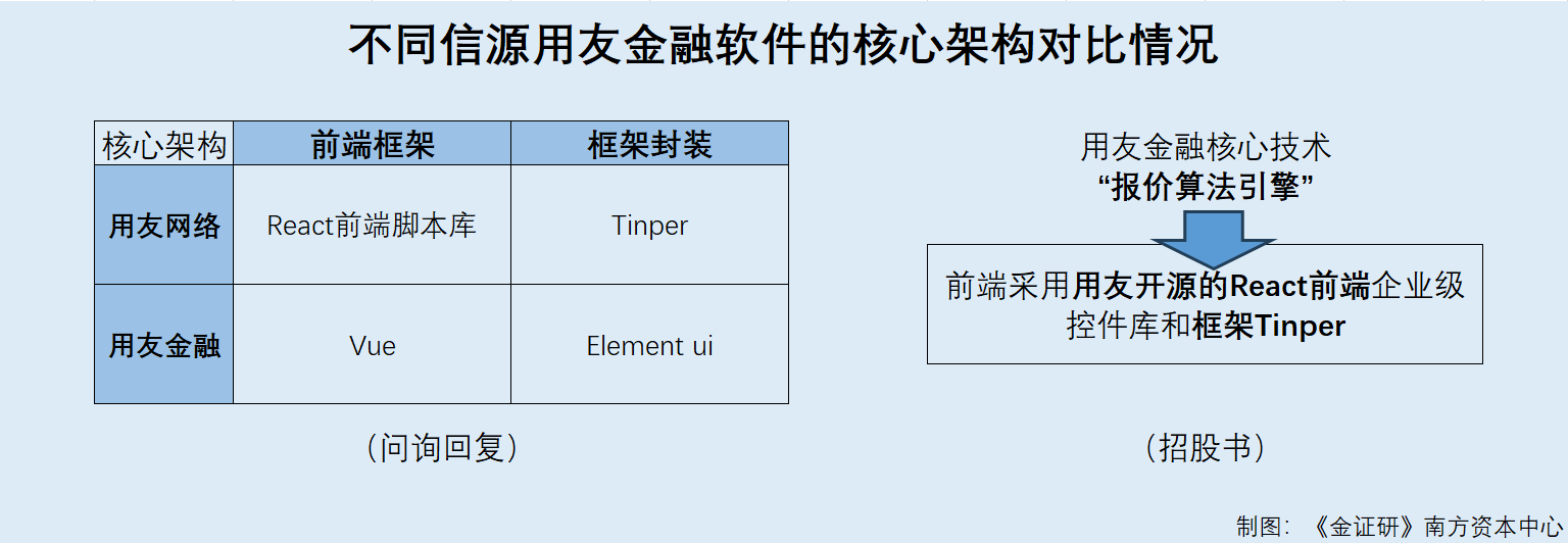 即是说,用友金融在问询回复中称,用友金融的新一代技术平台与用友网络的技术平台,在前端及后端框架上具有显著区别,并在此基础上封装了不同的核心引擎。