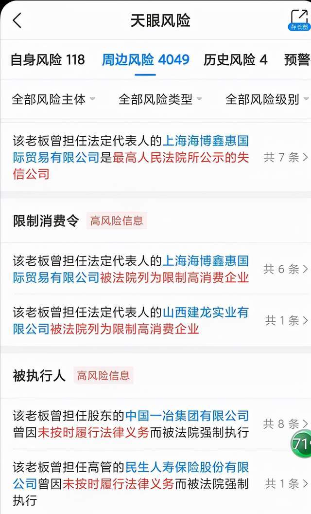 从结果来看,李兆会还是成了“败家子”。最近几年,李兆会不再露面,不知所踪。在一些企查软件上,搜索李兆会,搜出的自身风险和周边风险4000多条。