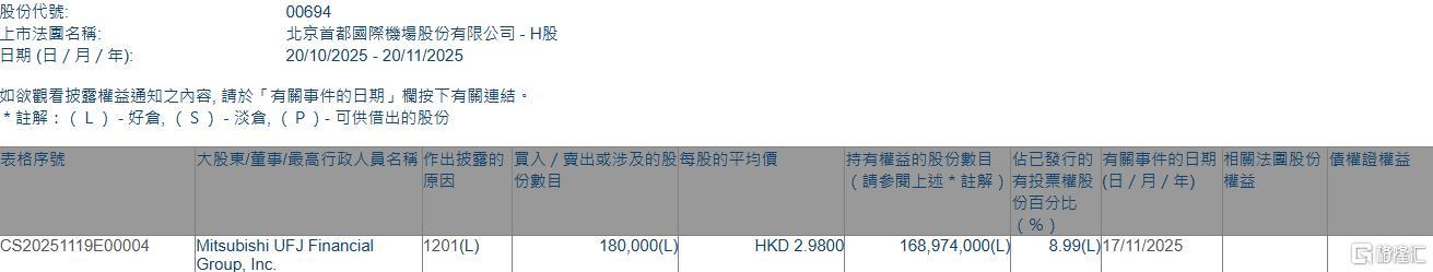 北京首都机场股份(00694.HK)遭Mitsubishi UFJ Financial Group减持18万股
