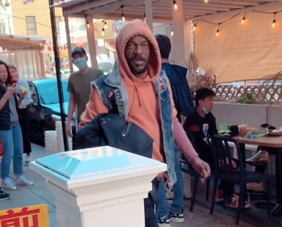 视频显示,一名55岁华裔女子正在街上走着,赖特迎面而来,突然挥拳朝着女子的脸部殴打并大喊,受害者遭重击后倒地,瞬间跌坐在一旁,半天无法动弹,靠着户外用餐座的柱子,赖特则大摇大摆地离开现场。
