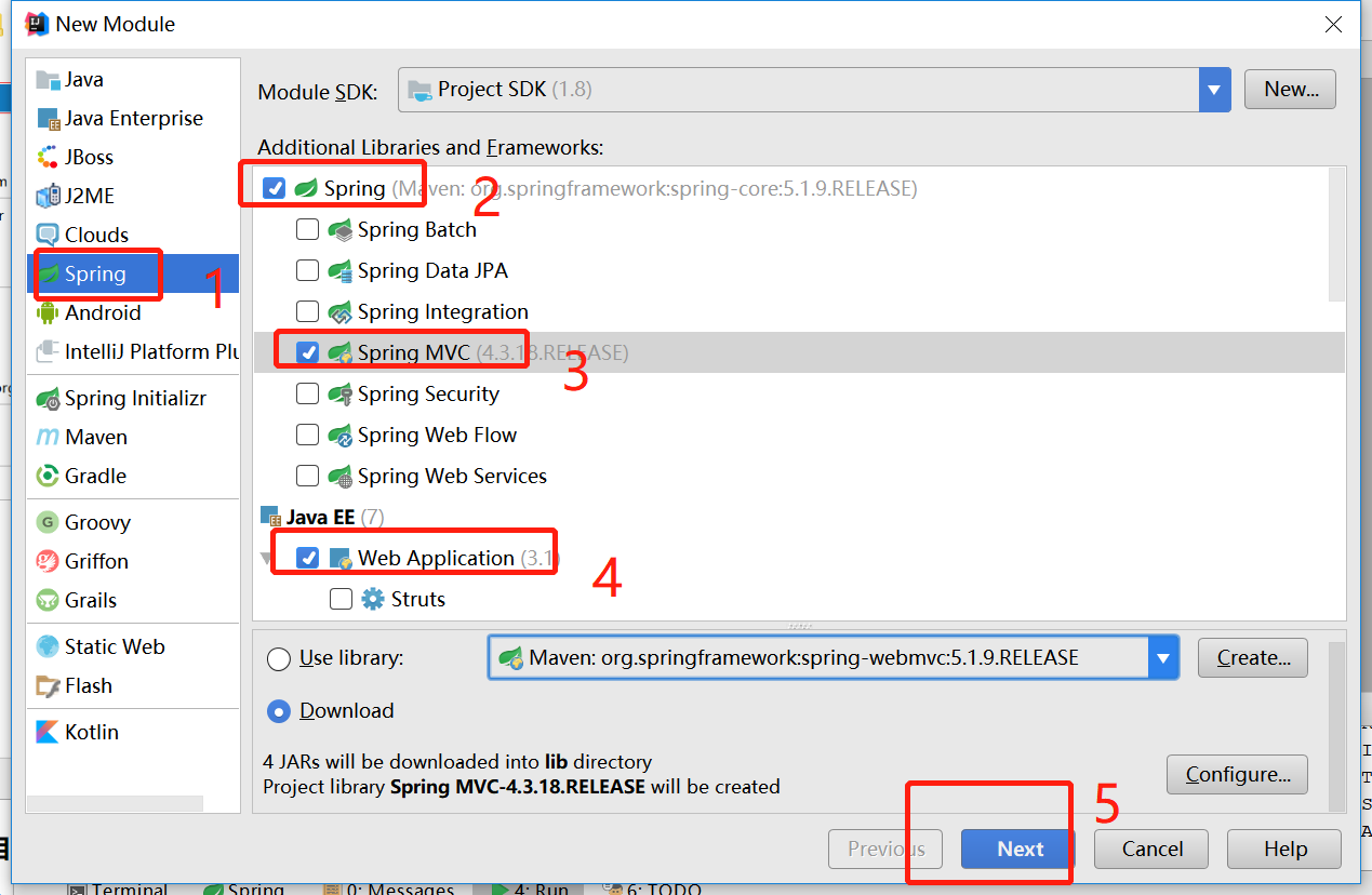 在弹出层。选择Spring.在右侧依次选择spring-->spring mvc