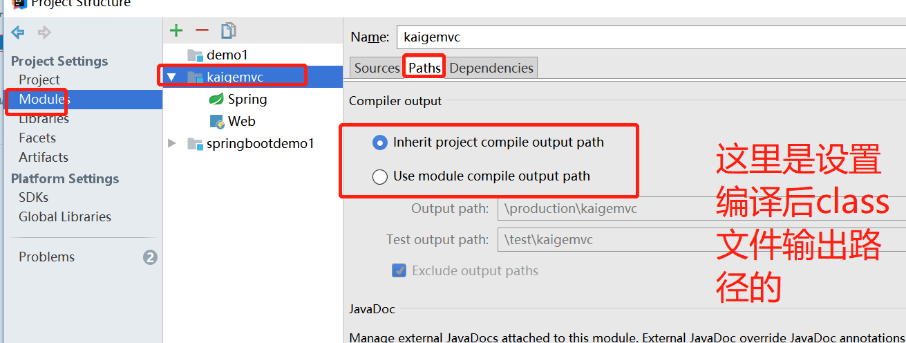 在弹出层,选择Module-->项目名-->Paths。设置class文件位置。如下图: