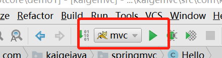 之后,我们就可以在导航栏中看到tomcat项目名。如下图。点击绿色三角就可以启动项目了。