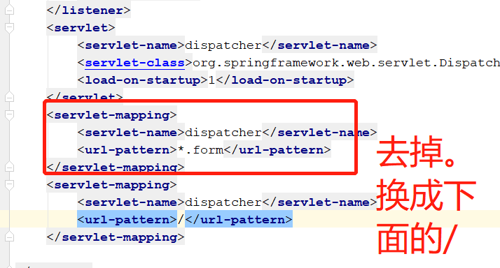 我们直接打开web.xml文件。(这里不的不说,idea真的很强大。把我们需要的都已经弄好了。)修改url-pattern为/.如下图: